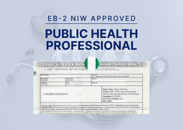 Estudo de Caso EB-2 NIW: profissional de saúde pública e farmácia da Nigéria aprovado, sem RFE Nigeria PhD em Farmácia e mestrado em Saúde PúblicaQuando hospitais enfrentam dificuldades na alocação de recursos, na coordenação do cuidado ou no aumento da demanda de pacientes, as consequências se espalham por todo o sistema de saúde. Os atrasos nos tratamentos se tornam mais longos, erros evitáveis de medicação passam a ocorrer com mais frequência, os custos aumentam tanto para os prestadores quanto para os pacientes, e as equipes clínicas sofrem uma sobrecarga que pode levar ao esgotamento profissional e à rotatividade. Essas falhas impactam mais do que organizações individuais: elas comprometem os resultados de saúde da comunidade, enfraquecem a capacidade de resposta em saúde pública e corroem a confiança no sistema que deveria proteger as pessoas quando elas mais precisam de cuidado. Nossa cliente dedicou mais de 15 anos de carreira atuando na interseção entre farmácia, saúde pública e análise de dados, aprimorando operações de saúde e processos de tomada de decisão por meio de estratégias baseadas em dados. A aprovação do EB-2 com National Interest Waiver (NIW) reflete o entendimento do USCIS de que seu trabalho de pesquisa e implementação trará benefícios substanciais aos sistemas de saúde pública dos Estados Unidos. À medida que o país enfrenta o aumento dos custos de saúde e o envelhecimento da população, profissionais como nossa cliente, que sabem modernizar a prestação de cuidados de saúde com análises avançadas, tornam-se essenciais. Preparado pelo advogado da Colombo & Hurd, Jason Qiu, o pedido foi aprovado de forma direta, sem a emissão de um Request for Evidence. Perfil do clienteUma carreira fundamentada nas necessidades reais do sistema de saúdeA peticionária é uma especialista em saúde e análise de dados cuja perspectiva foi moldada por desafios reais dentro dos sistemas farmacêuticos e de saúde. Ao longo de sua carreira, ela atuou no setor farmacêutico, melhorando a eficiência operacional, fortalecendo processos de tomada de decisão e implementando soluções orientadas por análises de dados para apoiar o atendimento ao paciente. Sua formação avançada, que inclui o título de Doutora em Farmácia e um mestrado em Saúde Pública, forneceu a base para integrar o conhecimento clínico com estratégias de dados em saúde pública. Com base nessa trajetória, ela desenvolveu uma iniciativa nos Estados Unidos focada no uso de análises avançadas de dados para ajudar instituições de saúde a tomarem decisões mais informadas e oferecerem um atendimento mais eficaz para os pacientes e menos oneroso para o sistema. O desafio Conectar uma expertise diversa a um desafio de saúde de relevância nacional Como sua formação abrange farmácia, saúde pública e análise de dados, o pedido exigiu uma narrativa clara e coesa que conectasse sua experiência diversa a um único projeto de relevância nacional. O advogado Qiu concentrou-se em identificar com precisão o problema que a profissional busca resolver, explicar quem se beneficia de seu trabalho e demonstrar por que essa atuação é importante em nível nacional. Neste caso, o desafio está relacionado à crescente pressão sobre os sistemas de saúde, em que o aumento da demanda de pacientes, as necessidades complexas de medicação e os dados fragmentados tornam cada vez mais difícil para as instituições alocar recursos de forma eficiente ou manter um atendimento de alta qualidade. Os beneficiários de seu trabalho incluem hospitais que buscam operações mais eficientes, profissionais de saúde que dependem de informações precisas e oportunas para tomar decisões bem fundamentadas e pacientes cujos desfechos melhoram quando os sistemas funcionam de forma integrada e segura. O fortalecimento desses sistemas é uma questão de interesse nacional, à medida que os Estados Unidos enfrentam o aumento dos custos de saúde e uma demanda crescente por cuidados coordenados e orientados por dados. O advogado Qiu fundamentou o projeto da cliente em necessidades documentadas do sistema de saúde dos Estados Unidos, demonstrando seu mérito e viabilidade. Resposta estratégica Desenvolvendo uma narrativa sólida de importância nacional O pedido vinculou diretamente o trabalho da profissional às prioridades de modernização do sistema de saúde dos Estados Unidos, incluindo esforços federais para fortalecer a tomada de decisão orientada por dados, melhorar a coordenação do cuidado e enfrentar o aumento dos custos em todo o sistema. Em vez de se apoiar em alegações abstratas, o pedido destacou sua experiência prática na melhoria de processos operacionais em saúde, no uso de análises de dados para apoiar decisões baseadas em evidências e no desenvolvimento de estratégias que reduzem ineficiências e aprimoram o atendimento ao paciente. O advogado Qiu enquadrou essas contribuições dentro de iniciativas federais relevantes, como o modelo AHEAD dos Centers for Medicare & Medicaid Services, que busca promover equidade em saúde, melhorar a prestação de cuidados e reduzir gastos por meio de uma melhor integração de dados. Confirmando o impacto concreto de seu trabalho, especialistas independentes atestaram sua capacidade de transformar dados em melhorias significativas, citando exemplos em que sua atuação aumentou a eficiência do atendimento e orientou uma gestão mais eficaz de recursos. O pedido deixou um ponto absolutamente claro: suas competências atendem a necessidades atuais e urgentes, não a cenários hipotéticos. O resultado Aprovação sem RFE O pedido foi aprovado sem a emissão de um Request for Evidence (RFE). Ao conectar de forma clara o projeto da cliente a prioridades nacionais documentadas do sistema de saúde, demonstrar suas qualificações notáveis e apresentar um plano detalhado para o trabalho proposto nos Estados Unidos