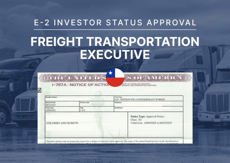 E-2 Case Study: Freight Transportation Entrepreneur From Chile Approval in 3 Months and 16 Days Chile Freight transportation entrepreneurOur Chilean client, an investor seeking to establish a refrigerated freight company in the United States, secured E-2 Treaty Investor status after an intensive review process. This case, handled by Attorney Dallan Bunce, was approved in just 3 months and 16 days on October 9, 2025, with premium processing, despite facing strict timelines and a complex Request for Evidence (RFE). Through focused coordination, careful documentation, and a proactive response strategy, Attorney Bunce helped the client move from a stressful waiting period to a successful approval, ensuring his business could move forward without interruption. E-2: Learn More Client ProfileFrom Sea Captain to Roadway Entrepreneur Before entering the world of U.S. logistics, our client spent more than ten years commanding vessels in South America’s maritime industry. As a ship captain, he managed crews, coordinated transport operations, and ensured the safe passage of passengers and freight through challenging coastal routes. Those years at sea built his discipline, leadership, and problem-solving skills. After moving to the United States, he transitioned into on-land logistics, gaining firsthand experience in freight movement across multiple states. His ability to adapt to new environments and uphold safety standards earned him a strong reputation among carriers. Alongside his professional work, he completed formal training in commercial driving and logistics management, equipping him with the skills to oversee operations both behind the wheel and from a managerial standpoint. His story reflects determination and growth. What began on open waters evolved into a mission to build a transport company that would serve one of the country’s most demanding industries: temperature-controlled freight. His background in navigation and logistics became the foundation for a venture that combined precision, responsibility, and vision. The Challenge Racing Against Time When the client reached out to Colombo & Hurd, he was close to losing his status in the United States. The urgency left little room for error or delay. Attorney Dallan Bunce recalled, “He was running out of time. If we had submitted even a little late, he would have been out of status.” The goal was clear: to secure a change of status through an E-2 investment in a refrigerated freight company. Launching a business from the ground up while working against a fixed deadline, however, came with heavy pressure. Every document, signature, and transaction needed to fall into place quickly and precisely. There was also a complication with the source of funds. As Attorney Bunce explained, “evidence he expected to use wasn’t as clear or illustrative after the second or third viewing as we thought it was.” What began as a simple investment turned into a detailed process of verifying and tracing every transfer. With little time left, the team had to prove that every dollar came directly from the client and was properly documented. See If you QualifyGet your free E-2 profile evaluation today. Evaluate My Profile The Approach Precision, Persistence, and Speed Faced with a tight deadline, Attorney Dallan Bunce and our legal team built their strategy around urgency and constant communication. Every step was designed to keep the case moving without pause. As he explained, “We approached everything with the filing deadline in mind.” The first step was to help the client identify a business model that could be launched quickly and managed effectively. Once the investment direction was set, the team shifted their focus to documentation. Instead of waiting for full sets of files, they encouraged the client to send every piece of evidence the moment it became available. “We told him not to wait until he had all the documents together,” Attorney Bunce said. “As soon as he got one, he sent it to us, and we looked at it right away.” This steady flow of updates allowed the team to review, correct, and strengthen materials almost in real time. When an RFE arrived, the same method continued: quick action, careful review, and consistent follow-up. The goal was to reinforce every element of the case with clear and credible evidence. Through disciplined teamwork and constant coordination, they built a response strong enough to overcome every question raised. The Result A Hard-Earned Approval Our client’s change of status petition was approved in just over three months. The outcome was especially meaningful given how difficult the case had been. Attorney Dallan Bunce reflected on it candidly, saying, “It ended up being a harder file than expected because of the time constraints. That’s why we were so excited about the result.” The approval came after the team’s detailed RFE response, which traced every dollar of the investment and proved that the business was real, active, and ready to operate. A strong legal strategy and our client’s persistence and trust in the process helped move fast, close every gap, and meet the strict requirements on time. Looking Forward Steering a New Chapter in Freight Logistics With the approval secured, our client is now focused on expanding his refrigerated freight operations in the United States. His next steps include adding new trucks to the fleet, hiring skilled drivers, and strengthening partnerships with logistics brokers. After years of managing transport both at sea and on the road, he now channels that same discipline and leadership into building a lasting business in the United States. Each successful delivery moves him closer to his vision of creating a company that keeps essential goods moving safely and efficiently across the country. Attorney Perspective Dallan BunceImmigration AttorneyRead More “My goal is always to make the process easier for the client. If that means more communication 