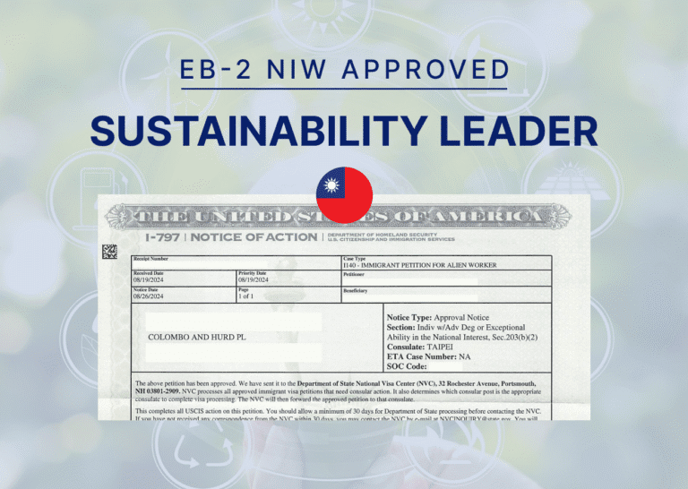 EB-2 NIW Case Study: Sustainability Leader From Taiwan Approval, No RFE Taiwan (Republic of China) Sustainability ProfessionalWhen our client, a senior program manager from Taiwan, dreamed of continuing his career in the U.S., he brought more than professional expertise. He brought a vision of a future where sustainability and innovation reshape logistics to make everyday life smarter, cleaner, and more efficient. Guided by Colombo & Hurd Senior Immigration Attorney Rachel Slomski, the client’s vision is now a reality. His EB-2 National Interest Waiver (NIW) approval opens new opportunities to expand his work and impact in the U.S. EB-2 NIW Visa: Learn More Client ProfileTransforming Data into Real-World ImpactEB-2 NIW VisaOur client has built an impressive career spanning more than 15 years in business strategy, logistics, and sustainable energy. With a Master of Business Administration and expertise in accounting, corporate finance, business analytics, and supply chain management, he has held senior roles at top-tier global firms, including a major consulting organization and a multinational technology company. Today, as a senior program manager, he leads transformative logistics optimization projects that tackle cutting-edge tools such as AI-driven route planning, predictive maintenance, warehouse automation, and advanced energy integration. His proposed endeavor in the United States supports critical national priorities: advancing energy goals, modernizing infrastructure, and strengthening supply chain resilience. The Challenge Proving National Value Through Logistics Optimization When the client approached our team at Colombo & Hurd, his credentials spoke for themselves. The challenge was to highlight his endeavor in a way that captured both his track record and the broader impact of his work. Our team focused on showing how his career and endeavor already reflect U.S. priorities: advancing energy goals, strengthening supply chain resilience, and modernizing critical infrastructure. From electrifying fleets to integrating AI into logistics, his endeavor aligned directly with goals such as those outlined in the Inflation Reduction Act and national supply chain initiatives. Our Petition focused on presenting a narrative that resonated: Sustainability and Innovation: His endeavor directly reduces emissions and brings modern energy into core logistics functions. Economic Competitiveness: By cutting inefficiencies and scaling advanced technologies, he helps U.S. businesses remain globally competitive. Leadership and Readiness: With an MBA and years of executive-level impact, he is equipped to lead and already does so on a global scale. To secure approval of the EB-2 NIW Petition for sustainability leader, we connected the client’s focused, technical endeavor to broader national benefits. Our team at Colombo & Hurd approached this challenge with a strategic mindset, building a case that clearly articulated the endeavor’s environmental, economic, and technological value to the United States. The Solution Connecting Sustainable Logistics to America’s National Goals To build the strongest Petition, our team worked with the client to craft a narrative that showed his professional record and how his endeavor supports the United States’ most pressing national priorities. Aligning the Endeavor with Federal Goals We highlighted how his endeavor connects to key U.S. goals, such as The Inflation Reduction Act (IRA): The client’s endeavor, as it relates to electrifying fleets and strengthening alternative energy resources, aligns with the IRA’s goal of accelerating advanced energy adoption and reducing greenhouse gas emissions across critical industries, including transportation and logistics. National Strategy for Advanced Manufacturing: The undertaking advances the Strategy’s mission to modernize U.S. infrastructure, boost manufacturing competitiveness, and integrate smart technologies into nationwide supply chains, by implementing AI-driven route optimization, warehouse automation, and robotics in logistics operations. Supply Chain Resilience Initiatives: The client’s logistics optimization models lower operational costs, reduce dependency on vulnerable supply routes, and create a more agile, secure transportation network, directly supporting federal objectives to safeguard national supply chains against disruptions. Critical and Emerging Technologies (CET) List: The client’s undertaking will develop and deploy technologies identified as critical to the U.S. economic security and global leadership, by integrating machine learning, predictive maintenance systems, and advanced infrastructure tools into logistics operations. Proving He Was Well Positioned by Establishing the Client’s Readiness to Lead the Endeavor The client’s proven leadership at major firms, combined with an MBA tailored to his proposed endeavor, demonstrated that he has the expertise and resources to execute his vision. He also submitted a detailed implementation roadmap for achieving his proposed endeavor, covering everything from technical integration to scalability and long-term monitoring. In discussing how the team approached the strategy, Ms. Slomski remarked: “While the EB-2 NIW does not require a U.S. job offer, if a client is working in the United States, it is a good opportunity to examine the position to see if it is something the client can use to integrate into their plan for their endeavor, to show they are well-positioned to further their endeavor. In this case, we were initially developing our client’s case as a consultancy, when he received a U.S. job offer that suited his endeavor. We were able to quickly adapt the endeavor and plan to his new position, and use the job offer as supporting evidence that he was well-positioned to further the proposed endeavor.” The Result Paving the Way for U.S. Leadership in Sustainable Logistics USCIS approved our client’s Petition without a Reque