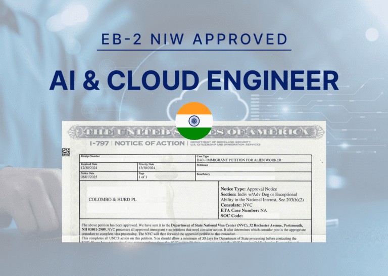This case was handled by Roshn Vazhel of Colombo & Hurd, a U.S. immigration law firm specializing in employment-based green cards including EB-2 NIW and EB-1A petitions. The firm has secured over 10,000 successful visa and green card approvals for clients from more than 100 countries, including more than 2,500 approvals in EB-2 NIW and EB-1A categories since 2023.