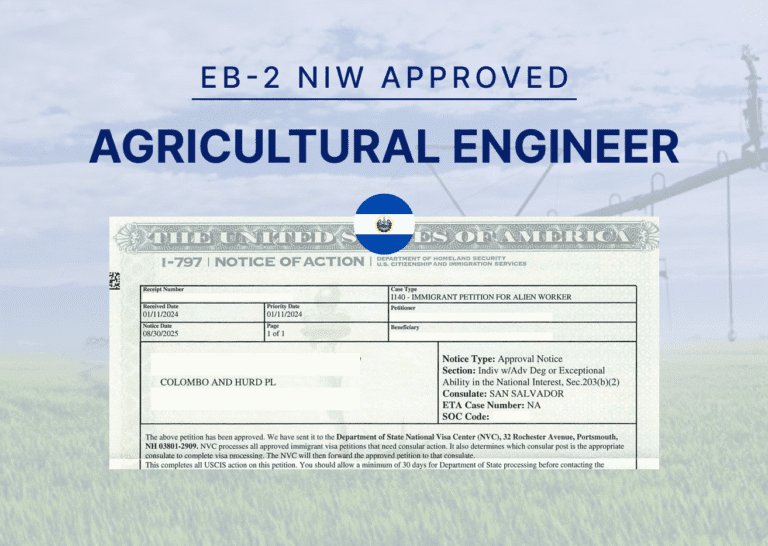 EB-2 NIW Case Study: Agricultural Engineer From El Salvador Approval El Salvador Agricultural EngineerFood insecurity remains a serious problem in the United States. In 2023, more than 47 million people lived in households struggling to access enough food, including nearly 14 million children. Families with children were hit the hardest, with almost one in five experiencing food insecurity. On August 30, 2025, Colombo & Hurd secured an EB-2 National Interest Waiver (NIW) approval for a distinguished agricultural engineer from El Salvador. His work develops solutions that can be applied widely to directly support national food security priorities. Guided by Colombo & Hurd’s legal team, the approval recognized the pressing nature of our client’s mission and his potential to strengthen U.S. food systems. He created a hands-on training program that helps farmers and communities reduce import dependency, strengthen local production, and promote healthier diets. EB-2 NIW: Learn More Client ProfileAn Agricultural Engineer Dedicated to Sustainable Farming and Food Security EB-2 NIW VisaDedicated to improving agriculture, our client has built a career focused on creating solutions that make farming both more productive and more sustainable. With a bachelor’s degree in Agricultural Engineering and 18 years of professional experience, he specializes in sustainable farming and crop cultivation. Over the years, he has introduced innovative practices that increase yields while reducing the use of harmful agrochemicals. His combination of technical expertise and innovative methods has positioned him as a respected voice in sustainable farming. Our client’s proposed endeavor in the United States is both urgent and practical. He seeks to reduce the nation’s dependence on imported vegetables and legumes while ensuring that food grown domestically is healthier and safer for consumers. To achieve this goal, he has created an integrated production model. This model combines sustainable cultivation methods, hands-on training in non-native crop production, and the establishment of experimental fields to prepare future farmers. Through this approach, he aims to advance food sovereignty, healthier diets, and long-term economic savings for American households. The Challenge Pursuing Innovation Without Sponsorship Barriers When our client first approached Colombo & Hurd, he faced a significant obstacle. He wanted to bring his expertise to the United States to strengthen the agricultural sector and expand his career. Yet, traditional immigration pathways were not a viable solution. Employer-sponsored visas would have restricted his independence, limiting his ability to carry out innovative projects that required flexibility and self-direction. As a result, the challenge was clear: we needed to demonstrate the national importance of his proposed endeavor and show that his background positioned him to make a meaningful impact in the United States. While his expertise was undeniable, the task lay in connecting his vision to critical national priorities such as food security, public health, and sustainable agriculture. The Solution Building the Case for Sustainable Agriculture in the U.S. Colombo & Hurd’s legal team approached the case with a clear vision: highlight his career in a way that directly addressed America’s needs. The United States is confronting food insecurity, heavy import reliance, and growing concerns about sustainability. His work, improving crop production, promoting healthier food, and training future farmers, fits directly into these urgent needs. Our team framed his vision within ongoing national initiatives. His model aligned with efforts like the White House Conference on Hunger, Nutrition, and Health and USDA programs supporting specialty crops. This connection showed that his work would build on priorities already recognized at the highest levels. For almost two decades, he had introduced pest-resistant crops, created organic fertilizers, and developed cost-saving farming techniques. These innovations weren’t theoretical; they had already improved farming practices and livelihoods. Moreover, he presented a roadmap that included training programs, experimental fields for communities, and collaborations with universities and agencies. This demonstrated that his impact in the U.S. would be practical, immediate, and lasting. Attorney Allison McVey, a dedicated immigration attorney at Colombo & Hurd specializing in employment-based petitions, explained: “Agricultural engineering endeavors like our clients are essential to supporting U.S. food systems resilience and national security. By creating this innovative, integrated production model, the U.S. can mitigate risks like supply shortages or price spikes, ensuring that food remains available and affordable during times of crisis.” The legal team also placed his work in a broader context. The U.S. is experiencing a shortage of agricultural engineers, with demand expected to rise over the next decade. His expertise would not replace American workers but instead fill a critical gap while helping advance food security. Through this narrative, we positioned him as a successful agricultural engineer and as a professional ready to help shape the future of American farming. See if you qualifyGet your free EB-2 NIW visa profile evaluation today. Evaluate My Profile The Result Advancing Food Security Through Immigration On August 30, 2025, USCIS approved the client’s EB-2 National Interest Waiver petition. The approval opens doors for collaboration with government agencies, universities, and private organizations, allowing his innovative work to benefit farmers, communities, and future generations. His work in the U.S. strengthens farming communities and ensures families have reliable access to healthy food. As Attorney Allison McVey explained, supporting small-scale, regional food producers can help stabilize prices and make food more