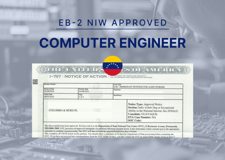 EB-2 NIW Case Study: Computer Engineer From Venezuela Approval Venezuela Computer EngineerWhen hospital emergency departments are overcrowded, patient outcomes are at risk. Innovative technology is emerging as a powerful solution to address this urgent national challenge. A Venezuelan computer engineer developed affordable software and digital primary care tools. His goal was to improve timely care and reduce hospital strain. On September 3, 2025, the client received approval of his EB-2 National Interest Waiver (NIW) petition. They demonstrated that his expertise goes beyond software development. It directly impacts emergency department crowding, affordable care access, and healthcare innovation. EB-2 NIW: Learn More Client Profile Exploring the Intersection of Computer Science and Health Care EB-2 NIW VisaWith a bachelor’s degree in computer engineering and nearly a decade of software development experience, our client has built a career creating efficient, reliable, and affordable digital solutions. His background in programming, system design, and software architecture gave him a strong technical foundation. This prepared him to tackle complex challenges and deliver measurable results. Today, he applies that expertise to U.S. healthcare. His proposed project develops digital primary care platforms to reduce emergency department overcrowding. These platforms give patients faster access to outpatient care for treatable conditions. They help hospitals preserve resources for urgent and life-threatening cases. Senior attorney Yadira Aguilar, who focuses exclusively on employment-based immigration, explains that while an advanced degree is an essential first step in an EB-2 NIW case, it is rarely enough on its own. “To qualify,” she notes, “clients must also prove that they have the practical and technical expertise to turn their proposed work into reality in the United States.” She explains that demonstrating expertise proves a petitioner is not only qualified on paper. It shows readiness to create meaningful impact in the country. By combining technical expertise with innovation, our client’s work supports national healthcare goals, relieves pressure on medical facilities, and improves patient outcomes. Beyond healthcare, the endeavor advances STEM innovation, creates jobs, and strengthens the U.S. economy. Also, it reinforces America’s long-term competitiveness in technology and digital health solutions. The Challenge Bridging Technology and National Healthcare Needs Although the client had a strong background in computer engineering, securing EB-2 NIW approval requires more than technical credentials. The challenge was proving his work as a software professional, usually seen as part of the tech sector, directly supported urgent U.S. healthcare priorities. USCIS often scrutinizes petitions that span multiple fields. In this case, the petition needed to establish that digital health solutions were not only innovative but also essential national healthcare goals, such as reducing emergency department overcrowding and improving patient access to care. Navigating cases that cross industries can be complex, explains senior attorney Yadira Aguilar. When a client’s academic background, like technology, doesn’t clearly align with a field such as healthcare, it becomes critical for the legal strategy to bridge that gap. “Immigration officials are often not experts in computer science,” she notes. “They may not immediately recognize the importance or relevance of the client’s work. This gives us the opportunity to explain the ‘what’ and ‘why’ behind the client’s background.” The Colombo & Hurd team connected the client’s software achievements to public health priorities. They addressed national importance, economic impact, and long-term sustainability. See if you qualifyGet your free EB-2 NIW visa profile evaluation today. Evaluate My Profile The Solution Highlighting National Importance Through Technology and Healthcare Our team developed a strategy that emphasized both technical expertise and national impact. They demonstrated that his background in software engineering, combined with leadership experience, positioned him as an innovator in digital healthcare. Supporting evidence included his leadership in software development teams and the successful digital health platforms he helped design. Expert testimonials also confirmed his ability to implement nationwide healthcare solutions. Further strengthening the case, the team tied his project to pressing healthcare priorities. By citing reports, government initiatives, and expert endorsements, they showed the project aligned with major policies. These policies include the Affordable Care Act, the White House Executive Order on high-quality care, and the CHIPS and Science Act of 2022. This evidence established that affordable digital primary care platforms could ease hospital strain and improve patient outcomes. The attorneys also highlighted the economic and workforce benefits of the client’s endeavor. The petition detailed how the project would create U.S. jobs, stimulate technological growth, and address the shortage of STEM professionals. By combining healthcare, economic, and innovation arguments, we presented a persuasive case that his contributions served the national interest. The Result Recognition of Expertise and a Path Forward Thanks to the strong strategy of our team, USCIS approved the EB-2 NIW petition. Our client gained the freedom to expand his work in the United States without being limited by employer sponsorship. He can now bring his vision to life, implementing affordable digital primary care platforms nationwide to reduce emergency department overcrowding, improve patient care, and directly support national healthcare goals. Reflecting on the approval, attorney Yadira Aguilar explains that it empowers the client to “leverage his academic background and extensive experience in comp