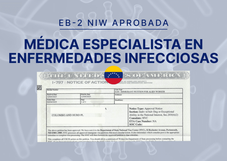 Caso de estudio EB-2 NIW: Aprobación para Médica Venezolana en la Presentación Inicial Venezuela MédicaNuestra clienta, especialista venezolana en enfermedades infecciosas, obtuvo la aprobación de una EB-2 por Interés Nacional (NIW) para crear una organización sin fines de lucro centrada en la prevención del VIH y de infecciones de transmisión sexual (ITS) en comunidades inmigrantes y otros grupos de alto riesgo. En un momento en que la prevención oportuna del VIH y de las ITS en poblaciones vulnerables sigue siendo una prioridad urgente de salud pública en Estados Unidos, USCIS aprobó la solicitud en la primera presentación, reconociendo el valor significativo de su trabajo comunitario en prevención. La abogada Verónica Virgen y el equipo de Colombo & Hurd se basaron en su trayectoria comprobada en la reducción de tasas de infección, en la dirección de programas hospitalarios de control de infecciones y en el diseño de iniciativas de prevención basadas en evidencia, para demostrar con éxito que ella está especialmente capacitada para liderar este proyecto en Estados Unidos. Check Your EB-2 NIW Eligibility Perfil del clienteProtegiendo a las comunidades frente a enfermedades infecciosas de alto impacto Visa EB-2 NIWLa solicitante es médica venezolana, especializada en enfermedades infecciosas y en el control de infecciones hospitalarias. Inició su carrera en su país, donde atendió enfermedades infecciosas complejas tanto en consultas externas como en hospitales. Su labor combinó la atención directa de pacientes con la prevención, el diagnóstico y el tratamiento de infecciones graves, afecciones que pueden propagarse con rapidez, saturar los sistemas de salud y poner en riesgo la vida si no se controlan de forma adecuada. A lo largo de su carrera, fue asumiendo un papel más amplio en salud pública en distintos países de Latinoamérica. Allí colaboró en la dirección de programas de control de infecciones, el seguimiento de tendencias epidemiológicas, la mejora de protocolos de seguridad y la formación de equipos clínicos. En su campo se le reconoce por su sólida capacidad de análisis y por una trayectoria constante en la reducción de tasas de infección y accidentes laborales mediante programas de prevención enfocados y eficaces. Con el proyecto que propone desarrollar en Estados Unidos, tiene previsto crear una organización sin ánimo de lucro dedicada a la prevención del VIH y otras infecciones de transmisión sexual. Su plan es integrar estrategias basadas en evidencia con actividades de educación comunitaria y servicios psicosociales, especialmente dirigidos a personas inmigrantes y otros grupos con mayor riesgo. Con ello, busca aportar a los esfuerzos nacionales para frenar el VIH/Sida y reducir la mortalidad prevenible. El desafío Enfocar la Prevención Comunitaria según los Criterios de la EB-2 NIW El principal desafío en este caso fue cómo encajar un proyecto de salud comunitaria centrado en la prevención dentro del estándar EB-2 NIW. No buscaba un puesto tradicional en un hospital ni obtener una licencia médica en Estados Unidos en esta etapa, y no contaba con una carta de interés de un empleador o centro hospitalario estadounidense. En su lugar, propuso liderar una organización sin fines de lucro dedicada a la prevención del VIH y de las ITS, así como a la educación y a la prestación de servicios de apoyo. Los médicos que solicitan la EB-2 NIW suelen optar por roles clínicos o de investigación más convencionales. En este caso, el equipo legal necesitaba demostrar que su trabajo en prevención, alcance comunitario y educación en salud pública es igual de crucial para los resultados de salud a nivel nacional que la atención directa en hospitales. También debían destacar cómo la organización que planea crear contribuiría a las estrategias estadounidenses más amplias en materia de VIH y salud pública, en lugar de considerarse una iniciativa puramente local. Como explica la abogada Verónica Virgen: “Teníamos que demostrar claramente que la prevención del VIH y de las ITS basada en la comunidad puede tener un impacto a nivel nacional, y que su liderazgo en este ámbito respalda directamente las prioridades de salud pública de Estados Unidos”. El equipo se centró en mostrar su valor como líder de iniciativas de prevención a gran escala, no solo como clínica atendiendo pacientes de manera individual. Respuesta estratégica Alineando la prevención comunitaria del VIH con las prioridades de salud pública de Estados Unidos Para lograr la aprobación de este caso EB-2 NIW, el equipo legal vinculó el trabajo de la solicitante con el panorama más amplio de la política estadounidense sobre VIH y otras ITS. La organización sin fines de lucro que planea crear encaja de manera natural en el movimiento nacional para acabar con la epidemia de VIH, reducir muertes prevenibles y ampliar el acceso a servicios de prevención en las comunidades con mayor riesgo. La estrategia destacó cómo su experiencia en enfermedades infecciosas respalda directamente iniciativas federales clave centradas en la prevención y en la respuesta comunitaria. La solicitante también contaba con un historial sólido que demostraba que estaba excepcionalmente preparada para llevar a cabo su proyecto, incluso sin contar con una carta de interés de un empleador estadounidense. Nuestro equipo puso en valor sus dos décadas de experiencia en enfermedades infecciosas, su liderazgo en programas de control de infecciones y su historial de reducción de tasas de infección y mejora de la seguridad hospitalaria. Cartas de expertos en su campo reforzaron su impacto y explicaron por qué sus habilidades son especialmente valiosas en Estados Unidos, donde existe una necesidad documentada de médicos y profesionales de salud pública capaces de manejar enfermedades infecciosas de alto impacto. La abogada Verónica Virgen destacó que la clave era p