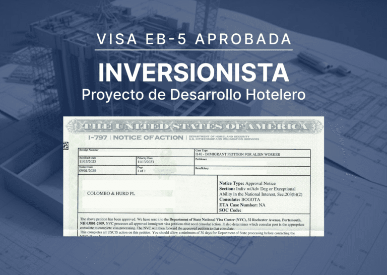 El abogado Dallan Bunce de Colombo & Hurd guió la solicitud a través de sus etapas finales hasta el éxito, con el cliente recibiendo su residencia permanente (green card) el 9 de septiembre del 2025. El equipo de Colombo & Hurd documentó los fondos legales del cliente con registros detallados, demostrando que la inversión estaba totalmente en riesgo en un Área de Empleo Específica (TEA) y demostró que el proyecto generaría los empleos requeridos. USCIS aprobó la solicitud I-526 sin emitir la solicitud de evidencia (RFE), confirmando el cumplimiento total de los requisitos EB-5.
