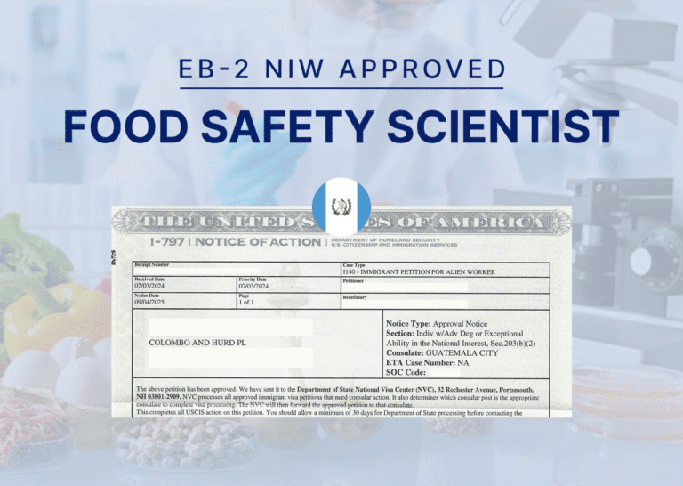 EB-2 NIW Case Study: Food Safety Scientist From Guatemala Approval, No RFE Guatemala Food Safety Scientist Food safety standards in the United States are set by federal inspectors and laboratories, but the responsibility for food safety often falls on small and medium-sized food processors. These businesses produce and process a large share of the nation’s food supply, yet many lack the dedicated staff to navigate complex regulations. The gap between regulatory requirements and practical implementation creates real vulnerabilities in the nation’s food system. Our client’s mission is to bridge this gap by helping food processing companies strengthen their compliance programs. When a single outbreak can put consumers at risk and cost industries millions, his work to raise food safety standards becomes all the more critical. Recently, Colombo & Hurd attorney David A. Santiago helped this professional navigate the EB-2 National Interest Waiver (NIW) process. Our client from Guatemala brought eight years of hands-on experience with U.S. Department of Agriculture (USDA) and Food and Drug Administration (FDA) compliance, breakthrough research in pathogen elimination, and a clear plan to serve the underserved small and medium-sized enterprise (SME) market. Mr. Santiago explained the motivation behind this case, noting that “we really wanted to emphasize the multi-layered economic, safety, and health benefits that the Petitioner could bring to better improve the U.S. food industry.” On September 4, 2025, United States Citizenship and Immigration Services (USCIS) approved his petition without requesting additional evidence. EB-2 NIW Visa: Learn More Client Profile A Career Devoted to Food Safety Our client has focused his career on raising food safety standards in the United States by helping small and medium-sized food processing companies strengthen their compliance programs. His education in food and animal science, including a Ph.D., gave him the foundation to pursue his endeavor of improving food safety. Beyond his academic credentials, he built over eight years of experience managing quality assurance operations, ensuring compliance with USDA and FDA regulations, and advancing research. One of his most notable achievements involved using industrial microwave technology to eliminate pathogens in food products, an innovation with immediate applications for processors across the industry. His work had been published in academic journals and recognized by peers for its practical value and commercial potential. The Challenge Serving a Vulnerable Market in the Food Safety Sector The client’s goal was to focus on the SMEs that process a significant portion of America’s food supply. Unlike large corporations, SMEs rarely have dedicated food safety departments, leaving them vulnerable to compliance issues and contamination risks. The challenge of this case was clear: how to design food safety programs that are practical, affordable, and include bilingual training, while also strong enough to meet federal standards. Just as important, these programs needed to be scalable, so that what worked in one plant could serve as a model for others across the country. To meet this challenge, he set out to design tailored Hazard Analysis Critical Control Point (HACCP) plans, provide training, and help SMEs build programs that would bring them into compliance and reduce risks. Mr. Santiago noted that “he was not only helping small and medium-sized businesses in the food industry, he also wants to create customized plans that will support disease prevention to Americans and promote a better quality of life through safer food consumption.” To achieve that goal, he needed the independence to consult widely and build long-term partnerships across the industry. The EB-2 NIW offered a path that would allow him to deliver these services at scale and fully realize his vision for improving food safety. The Solution Building a Compelling Case Attorney David A. Santiago emphasized how our client’s expertise fit into broader national priorities. Foodborne illness sickens 600 million people worldwide each year, and in the United States it costs billions in healthcare expenses. His work directly supported the federal government’s strategy to enhance food security by improving the safety and resilience of the food supply. SMEs were at the center of his proposed endeavor. These businesses are vital to food systems, providing essential nutrition and food security, yet they often lack the expertise to meet regulatory requirements on their own. By offering tailored programs, he was positioned to address a critical gap in the nation’s food safety infrastructure. We also highlighted industry interest in the client’s work, showcasing the clear demand for his skills. A beef processing company expressed interest in forming a partnership to deliver comprehensive food safety solutions across its industry network. Similarly, a poultry producer requested training and consulting services to strengthen their practices and ensure regulatory compliance. A professor from a major university’s Department of Animal and Food Sciences also sought collaboration, recognizing both the commercial value and the practical applications of his expertise. Recognizing that “his innovative strategies would help modernize the overall U.S. food industry,” Mr. Santiago highlighted these endorsements to demonstrate that the client’s proposed endeavor was ready to be implemented in the United States. See if you qualifyGet your free EB-2 NIW visa profile evaluation today. Evaluate My Profile The Result EB-2 NIW Approval Without RFE USCIS approved our client’s EB-2 NIW petition without issuing a Request for Evidence (RFE). This outcome reflects the strength of both his qualifications and the petition’s presentation. Because RFEs are so common in many EB-2 NIW cases, avoiding one is a clear sign of compelling evidence and clear argu