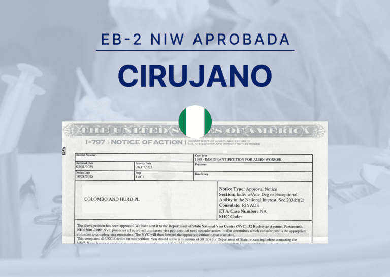 Caso de estudio EB-2 NIW: Aprobación para Cirujano de Nigeria en 6 Meses y 21 Días, Sin RFE Nigeria Cirujano e investigadorNuestro cliente, un cirujano cardiotorácico oriundo de Nigeria, se propuso redefinir la medicina cardiovascular mediante la inteligencia artificial (IA). Bajo la asesoría de Vivian Daher, abogada senior de inmigración en Colombo & Hurd, su petición de visa EB-2 con Exención por Interés Nacional (NIW) fue aprobada sin requerimiento adicional de pruebas (RFE), reconociendo la importancia nacional de su plan para integrar la IA en la atención de emergencias médicas en todo Estados Unidos. Check Your EB-2 NIW Eligibility Perfil del ClienteDel Quirófano a la Vanguardia en Innovación MédicaVisa EB-2 NIWNuestro cliente es un cirujano cardiotorácico, educador, e investigador nigeriano con más de 15 años de experiencia salvando vidas y capacitando a la próxima generación de profesionales médicos. Su trayectoria comenzó en hospitales de Nigeria, donde su compromiso con la mejora del diagnóstico y tratamiento de enfermedades cardíacas lo llevó a liderar centros quirúrgicos de vanguardia en el extranjero. Ya sea pasando largas noches en el quirófano o enfocándose en la creación de protocolos de emergencia que han salvado a innumerables pacientes, su camino ha estado siempre marcado por la dedicación y el compromiso con la vida humana. Desde su puesto como Jefe de Cirugía Cardiotorácica en un renombrado hospital en el extranjero, comenzó a explorar cómo la inteligencia artificial podía complementar la evaluación humana en la medicina cardiovascular. Se dio cuenta de que la tecnología podía analizar patrones para predecir enfermedades, guiar cirugías, y personalizar tratamientos a una escala que permitiría transformar los resultados para los pacientes. Este descubrimiento inspiró su proyecto en los Estados Unidos para integrar la inteligencia artificial en la medicina cardiovascular a través de la colaboración con instituciones de investigación y hospitales de todo el país. En paralelo a su carrera como cirujano, nuestro cliente trabajó capacitando a estudiantes médicos y residentes. También es co- autor de investigaciones pioneras sobre inteligencia artificial e innovación en cirugía, y completó cursos de entrenamiento avanzado en AI y atención médica. Su objetivo es acercar la tecnología a la experiencia clínica para forjar un futuro en el cual el cuidado del corazón sea una tarea más segura, rápida y precisa. El Desafío Integrando Medicina y Tecnología en una Misma Visión Cuando este caso llegó a manos de la abogada senior Vivian Daher, un primer gran desafío consistió en hacer converger dos áreas distintas en un mismo proyecto. “El cliente tenía un perfil muy robusto tanto en medicina como en tecnología,” afirma la Dra. Daher. “Pero el desafío radicaba en traducir lo que él quería hacer en algo que verdaderamente reflejara su impacto más amplio. Tuvimos que definir de qué manera su trabajo con AI y medicina cardiovascular podría beneficiar a los Estados Unidos en su conjunto.” Lograr un equilibrio entre dos disciplinas complejas dentro de la categoría de Ciencia, Tecnología, Ingeniería y Matemáticas (STEM) fue una oportunidad única. Como asevera la Dra. Daher, “Este fue el primer caso en el que pude combinar ambas esferas. No solamente teníamos a un doctor en Ciencia, sino también en Tecnología, dos disciplinas reconocidas como STEM. Eso hizo que el caso fuera mucho más potente.” Respuesta Estratégica Alineando cada Detalle para Fortalecer el Caso La abogada Daher armó el caso apoyándose en un marco claro que mostraba tanto el alcance nacional como el impacto sanitario cuantificable del proyecto del cliente. “No existe una estrategia única que funcione para todos,” aclara. “Todos los elementos del caso, incluyendo la evidencia, las declaraciones, y la documentación, deben ser consistentes y estar alineados estratégicamente para fortalecer la credibilidad y claridad de la petición.” Al proponerse como contratista independiente, el cliente tenía la posibilidad de establecer vínculos de colaboración profesional con hospitales, instituciones de investigación, y otras organizaciones médicas. La abogada Daher identificó algunos de estos potenciales socios específicos en Estados Unidos- como centros académicos, organizaciones especializadas en cardiología, y programas focalizados en trauma- de los cuales el cliente pudo obtener cartas de interés que permitieron probar la predisposición de entidades relevantes a colaborar con su proyecto. Cada elemento del plan del cliente, donde por ejemplo explicaba cómo iba a implementar el diagnóstico orientado por inteligencia artificial, o la predicción de riesgo y monitoreo de pacientes a través de esta tecnología, estuvo basado en experiencias clínicas reales, lo cual hizo que su iniciativa científica fuera verosímil y fácil de interpretar. La Dra. Daher también destaca la viabilidad y estructura del proyecto del cliente. Su programa incluía un plan detallado de servicios y precios, lineamientos regulatorios y éticos, capacitación para profesionales clínicos e hitos piloto que demostraban cómo el proyecto podía mantenerse de forma autosuficiente. Para otorgar mayor solidez a la presentación final, la abogada Daher organizó la documentación para que la educación del cliente, sus licencias profesionales, su trayectoria en puestos de liderazgo, publicaciones, y las evaluaciones de expertos se alinearan bajo una misma narrativa coherente. Asimismo, la Dra. Daher subraya la constante colaboración con el cliente como un aspecto fundamental para asegurar la precisión e integridad del caso. “Cuando la presentación inicial del caso es exhaustiva y bien estructurada, se reduce significativamente la posibilidad de recibir un pedido para ampliar la evidencia,” explica. El Resultado Aprobación para Integrar Intel