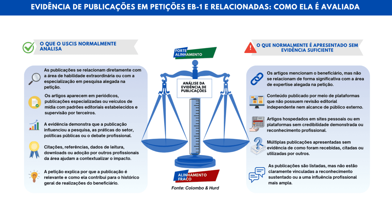 Nesta Página Como as publicações são avaliadas em petições EB-1A Preparando a evidência de publicações para a adjudicação do EB-1A em 2026 Quando o USCIS questiona o impacto das suas publicações? O que fazer se o USCIS emitir um RFE ou levantar dúvidas sobre o impacto das suas publicações? Conclusão avalie o seu perfil Um histórico sólido de publicações reflete anos de dedicação, pesquisa e contribuição profissional. Para peticionários do EB-1, as publicações podem ser uma prova poderosa de habilidade extraordinária ou realização excepcional, mas apenas quando sua relevância é claramente articulada. Compreender como o United States Citizenship and Immigration Services (USCIS) avalia a evidência de publicações é essencial, pois os oficiais vão além do volume para analisar impacto, relevância e reconhecimento independente. Nos últimos anos, a adjudicação das petições de habilidade extraordinária EB-1A e de pesquisador excepcional EB-1B tornou-se mais detalhada e orientada por evidências. Os oficiais têm a tarefa de avaliar se as publicações demonstram influência significativa dentro de um campo. Métricas, reconhecimento independente e credibilidade contextual passaram a desempenhar um papel maior na forma como a evidência de publicações é analisada. Neste artigo, examinamos como o USCIS avalia publicações, por que às vezes surgem questionamentos sobre impacto e onde os peticionários costumam encontrar desafios. Como as publicações são avaliadas em petições EB-1A Publicações em periódicos acadêmicos ou em grandes revistas especializadas são uma forma reconhecida de prova em muitas petições de imigração baseada em emprego, incluindo os casos EB-1A, EB-1B e EB-2 National Interest Waiver (NIW). Para petições de habilidade extraordinária EB-1A, tanto a autoria de artigos acadêmicos na área de especialização quanto material publicado sobre o beneficiário em publicações profissionais ou de grande circulação, ou em outros meios de comunicação relevantes, estão expressamente listados entre os dez critérios regulatórios, dos quais pelo menos três devem ser atendidos. Quando apresentadas de forma eficaz, as publicações podem ser persuasivas porque fornecem confirmação independente da expertise e da influência profissional. Artigos de autoria própria podem demonstrar autoridade no assunto, enquanto a cobertura por terceiros pode refletir maior visibilidade. Os oficiais analisam o conteúdo de forma substancial, incluindo o histórico de citações, a credibilidade do veículo de publicação, a independência editorial e a relevância para o campo alegado. Na prática, um número menor de publicações bem documentadas e de alto impacto costuma ter mais peso do que uma lista extensa apresentada sem contexto. obtenha uma avaliação gratuita do perfil Preparando a evidência de publicações para a adjudicação do EB-1A em 2026 À medida que os padrões de adjudicação continuam a evoluir, a evidência de publicações vem sendo cada vez mais avaliada sob uma perspectiva prospectiva, que enfatiza clareza, credibilidade e influência comprovável. Para petições protocoladas em 2026, as publicações são mais eficazes quando estão intencionalmente alinhadas ao campo de habilidade extraordinária alegado e sustentadas por indicadores objetivos que reflitam reconhecimento profissional contínuo. Alinhar as publicações ao campo alegado e à estratégia da petição Nos pedidos apresentados em 2026, espera-se que a evidência de publicações demonstre uma conexão clara e consistente com o campo de atuação identificado na petição. Publicações em periódicos amplamente reconhecidos, revistas especializadas de grande relevância ou veículos de mídia estabelecidos tendem a fornecer um contexto mais claro para a avaliação. Igualmente importante é documentar o papel do beneficiário em cada publicação, como autoria principal, participação editorial ou contribuição como especialista convidado, a fim de esclarecer o nível de contribuição e o posicionamento profissional. Enfatizar indicadores mensuráveis e contextuais de impacto Tendências recentes de adjudicação indicam um foco contínuo em como a influência pode ser avaliada e verificada. Atividade de citações independentes, adoção profissional, número de downloads, licenciamento e referências por terceiros ajudam cada vez mais a situar as publicações dentro de um panorama profissional mais amplo. Quando aplicável, evidências de que uma publicação contribuiu para mudanças em direções de pesquisa, práticas do setor ou considerações de política pública podem reforçar ainda mais sua relevância. Priorizar reconhecimento independente e validação por terceiros A avaliação independente continua sendo central na análise do impacto das publicações. Cartas de opinião de especialistas que abordem a relevância de publicações específicas, juntamente com cobertura independente na mídia, ajudam a demonstrar reconhecimento além do ambiente profissional imediato do peticionário. Convites para palestrar, revisar trabalhos ou contribuir com análises especializadas relacionadas às publicações também podem reforçar o posicionamento profissional associado a esses trabalhos. Consolidar a evidência de publicações em um registro estruturado de impacto Para petições em 2026, organização e apresentação seguem sendo fatores importantes. A evidência de publicações é mais eficaz quando resumida em um formato estruturado que permita aos adjudicadores avaliar o impacto de forma eficiente. Um registro consolidado pode incluir títulos e datas das publicações, o papel do beneficiário, os veículos de publicação, dados de citações, métricas de impacto, relevância para o campo e indicadores de reconhecimento independente. Preservar documentação contemporânea Manter registros no momento da publicação o