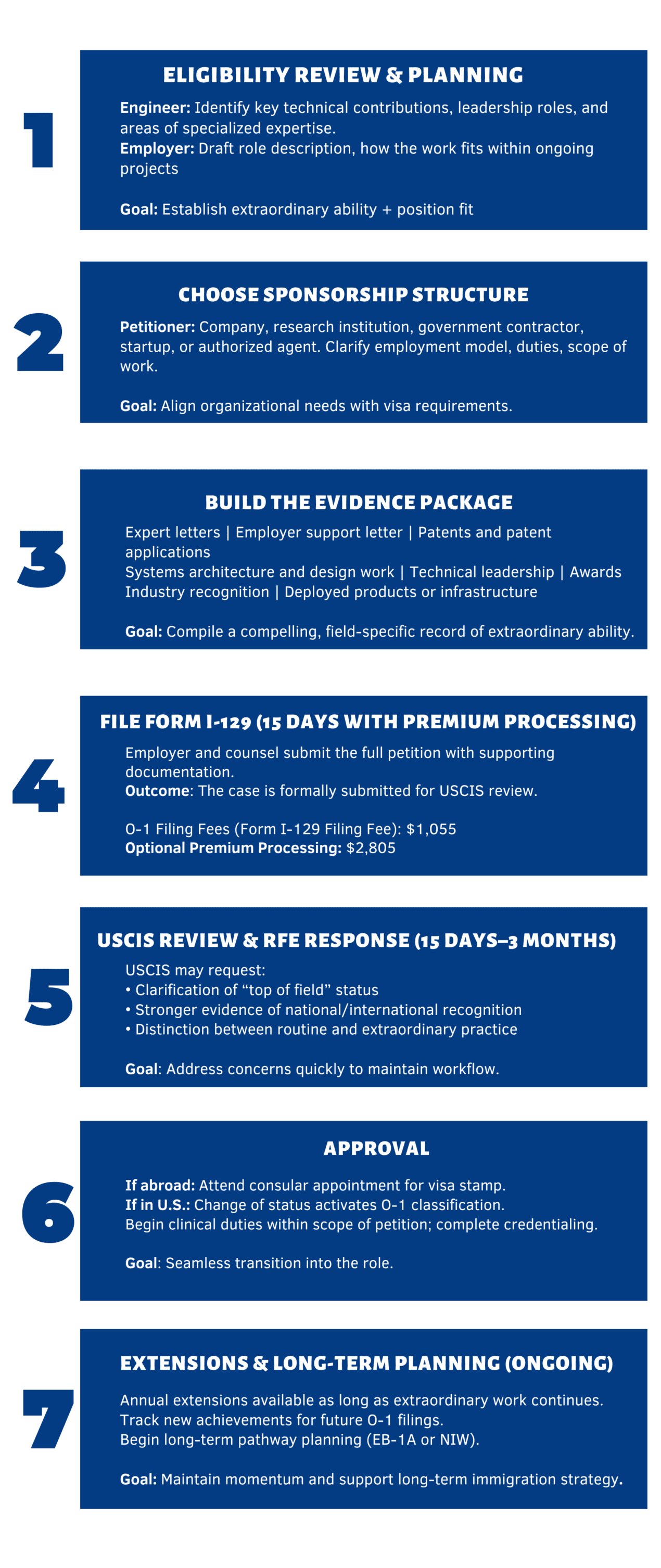 On This Page What Is the O-1 Visa? How Engineering Careers Fit the O-1 Framework Key Types of Evidence for Engineers O-1 Visa Step-by-Step Guide for Engineers Common Misconceptions About Engineers and the O-1 The O-1 in Relation to EB-2 NIW and EB-1A Practical Advice for Engineers Considering the O-1 evaluate your profile Engineers shape the systems that modern life depends on. Some work in academic labs, others inside private companies, and many move between research and industry over the course of their careers. Their impact appears in products that perform reliably, infrastructure that remains secure, and technologies that scale successfully from concept to deployment. This work may involve fewer traditional publications, yet it can still demonstrate originality, significant responsibility, and sustained recognition within the field. The O-1 visa for engineers is designed to recognize this type of professional record. For engineers, the O-1 is a flexible nonimmigrant option that supports continued technical work in the United States. It is well suited to professionals whose achievements are demonstrated through innovation, technical leadership, and responsibility for complex systems. When an engineering record is explained clearly and supported by appropriate evidence, it can align closely with the O-1 regulatory criteria, even when publishing is limited or absent. This guide explains how the O-1 framework applies to engineers across industries, which types of evidence tend to be persuasive in practice, and how strategy often differs by career stage. What Is the O-1 Visa? The O-1 is a temporary, nonimmigrant visa category for individuals with extraordinary ability in fields such as science, education, business, or athletics. Engineers most often pursue the O-1A classification, which covers technical and scientific professions. The petition is filed by a United States employer or an authorized agent, and it asks USCIS to recognize that the engineer will continue working in the same area of specialized expertise where they have already established a record of achievement. An initial period of O-1 status may be granted for up to three years. Extensions are available in one-year increments as long as the underlying work continues. Spouses and unmarried children under 21 may apply for O-3 status, which allows them to live and study in the United States while the engineer holds O-1 status. USCIS evaluates O-1A petitions using eight regulatory criteria, and the petition must satisfy at least three. These criteria include major awards, selective memberships, published material about the engineer, participation as a judge of the work of others, original contributions of major significance, authorship of scholarly articles, a critical or essential role for distinguished organizations, and high compensation compared to others in the field. Not every criterion fits every engineering career. Strong cases focus on the criteria that match how engineering achievement is actually shown and then present evidence in a way that makes technical impact clear to a nontechnical reader. For a detailed overview of every O-1 criterion and how they are applied, you can review Colombo & Hurd’s complete O-1 guide. How Engineering Careers Fit the O-1 Framework Engineering careers often differ from traditional academic paths. Many engineers work on long-term projects within companies or government programs, where confidentiality, teamwork, and iterative development are standard. Recognition often comes through patents, leadership roles, successful deployments, or reliance by customers and partners, rather than through publications. The O-1 framework is flexible enough to recognize these differences. USCIS evaluates whether the engineer’s work shows sustained recognition and stands out in the field, often through original contributions, problem-solving, and the trust placed in their judgment or designs. Successful petitions translate technical work into clear, accessible language that explains the significance and impact of the engineer’s contributions. Key Types of Evidence for Engineers Patents and Intellectual Property Patents and patent applications are often some of the most persuasive evidence in engineering O-1 cases. A granted patent supports an argument of novelty. The strongest support usually comes from what happened next, such as licensing, commercialization, product integration, or credible proof that others in the field have cited or relied on the patented technology. Pending applications can also help when they are paired with documentation that the work moved beyond an idea, including development milestones, testing results, or deployment plans. Design Work and Systems Development Engineering achievement is frequently best shown through what was built. Architecture for large scale software platforms, manufacturing processes, safety critical systems, energy infrastructure, robotics, and telecommunications networks can all support an O-1 petition when the engineer’s role is clear. USCIS is looking for evidence that the engineer made meaningful technical decisions, solved nontrivial problems, or created designs others relied on. Evidence is less persuasive when it only shows routine implementation without independent indicators of responsibility or impact. Technical Leadership and Responsibility Leadership in engineering is often technical before it is managerial. Owning a project, setting technical direction, reviewing the work of other engineers, mentoring teams, and serving as a subject matter authority can all demonstrate recognition and influence. Independent letters are especially important here because they help explain why the engineer’s judgment carried weight and how their leadership affected outcomes beyond their immediate team. Certifications and Specialized Credentials Certain certifications can strengthen a case when they reflect selective standards and are closely tied to the eng