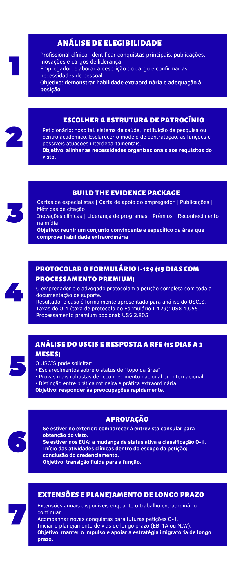 Nesta Página Por que o visto O-1 é uma opção estratégica para profissionais da área da saúde Critérios de elegibilidade do O-1 para profissionais da área médica Guia passo a passo do visto O-1 para profissionais da área da saúde Tendências do visto O-1 em 2026 para profissionais da área da saúde Conclusão Avalie seu perfil A inovação em saúde hoje tem alcance global. Avanços em cardiologia se espalham por continentes da noite para o dia; inovações cirúrgicas são compartilhadas em conferências médicas internacionais, e profissionais de saúde colaboram além das fronteiras em tempo real para resolver os desafios de saúde mais complexos do mundo. Os profissionais da área da saúde desempenham um papel cada vez mais crítico nos Estados Unidos, especialmente em áreas que exigem formação avançada, expertise especializada e liderança na prática clínica, na pesquisa e na inovação. Como resultado, o sistema de saúde dos EUA passou a depender mais de talentos formados internacionalmente para atender à demanda. Dados nacionais sobre a força de trabalho mostram que profissionais imigrantes representam quase 20% da força de trabalho hospitalar nos Estados Unidos, proporção que deve crescer à medida que as necessidades dos pacientes aumentam e os cuidados especializados se tornam mais complexos. Nesse cenário, profissionais da saúde com conquistas extraordinárias têm mais oportunidades e mais opções do que nunca. O visto O-1 é uma dessas possibilidades. Não é a única via, mas para aqueles cujo trabalho se destaca em nível nacional ou internacional, o O-1 oferece vantagens estratégicas em termos de flexibilidade, reconhecimento e crescimento de carreira. Este artigo explica quando o visto O-1 faz sentido para profissionais da área da saúde, como construir uma petição convincente, quais desafios antecipar e como o O-1 se encaixa em uma estratégia de imigração e carreira de longo prazo, tudo isso sob a ótica da evolução do sistema de saúde dos Estados Unidos. Para uma análise aprofundada do visto O-1 de forma geral, leia primeiro nosso guia completo. Por que o visto O-1 é uma opção estratégica para profissionais da área da saúde Visão geral do visto O-1 Criado para indivíduos que alcançaram o topo de suas áreas, o O-1 é um visto de não imigrante destinado àqueles que demonstram “habilidade extraordinária” em ciência, medicina, negócios, artes, esportes ou educação. O que diferencia o O-1 é sua flexibilidade e valor estratégico, especialmente em um cenário de talentos no qual a demanda por profissionais de saúde supera amplamente a oferta. Em 2025 e com projeção para 2026, as tendências de aprovação têm permanecido fortes. Essa via é altamente viável para profissionais da área da saúde cujas conquistas podem ser claramente demonstradas por meio de publicações, impacto clínico, inovação, liderança ou outros indicadores de destaque. Por que o O-1 funciona para profissionais da área da saúde Para profissionais da área da saúde que atuam na linha de frente da medicina, lideram colaborações em pesquisa, inovam práticas clínicas, publicam em periódicos de alto impacto ou moldam modelos de cuidado ao paciente, o visto O-1 pode oferecer vantagens significativas. Ele reconhece a habilidade extraordinária, oferecendo a profissionais de alto nível uma via que se alinha ao grau de influência e distinção que já alcançaram em sua área. Para empregadores, o O-1 é igualmente estratégico. Hospitais, sistemas de saúde e instituições de pesquisa que competem por talentos excepcionais enfrentam dois grandes desafios: vias de visto incertas e necessidades de pessoal cada vez mais urgentes. Como o O-1 não está sujeito a limite anual nem a sorteio, ele permite que as instituições recrutem clínicos e pesquisadores de destaque sem a imprevisibilidade presente em outras categorias de visto. Critérios de elegibilidade do O-1 para profissionais da área médica Estrutura regulatória O visto O-1 é baseado em um padrão jurídico elevado: habilidade extraordinária, demonstrada por meio de reconhecimento sustentado em nível nacional ou internacional e por evidências de que o indivíduo atingiu o mais alto patamar em sua área. Embora esse padrão se aplique a diferentes disciplinas, sua aplicação nos campos da saúde e da medicina exige uma interpretação cuidadosa e específica ao contexto. Em geral, profissionais da área da saúde se enquadram na categoria O-1A, destinada a indivíduos com habilidade extraordinária nas ciências, educação, negócios ou esportes. De acordo com os regulamentos do USCIS, a habilidade extraordinária para o O-1A deve ser comprovada por meio de uma das seguintes formas: Um prêmio de grande reconhecimento internacional (como um Prêmio Nobel), ou Pelo menos três dos oito critérios de prova estabelecidos, que incluem: Recebimento de prêmios reconhecidos em nível nacional ou internacional Filiação a associações que exigem conquistas excepcionais Publicações sobre o indivíduo em grandes veículos de mídia ou em publicações profissionais relevantes Participação como julgador do trabalho de outros profissionais Contribuições científicas, acadêmicas ou clínicas originais de grande relevância Autoria de artigos acadêmicos em periódicos profissionais ou em outras publicações de destaque Atuação em posição crítica ou essencial para organizações de reputação distinta Percepção de salário elevado ou remuneração superior em comparação com outros profissionais da área Na medicina e na área da saúde, esses critérios frequentemente se alinham de forma natural à maneira como a excelência é avaliada. As provas podem assumir a forma de publicações influentes, impacto de citações, convites para conferências, liderança em pesquisas, inovações em nível de sistema, reconhecimento na mídia ou ocupação de cargos de alto