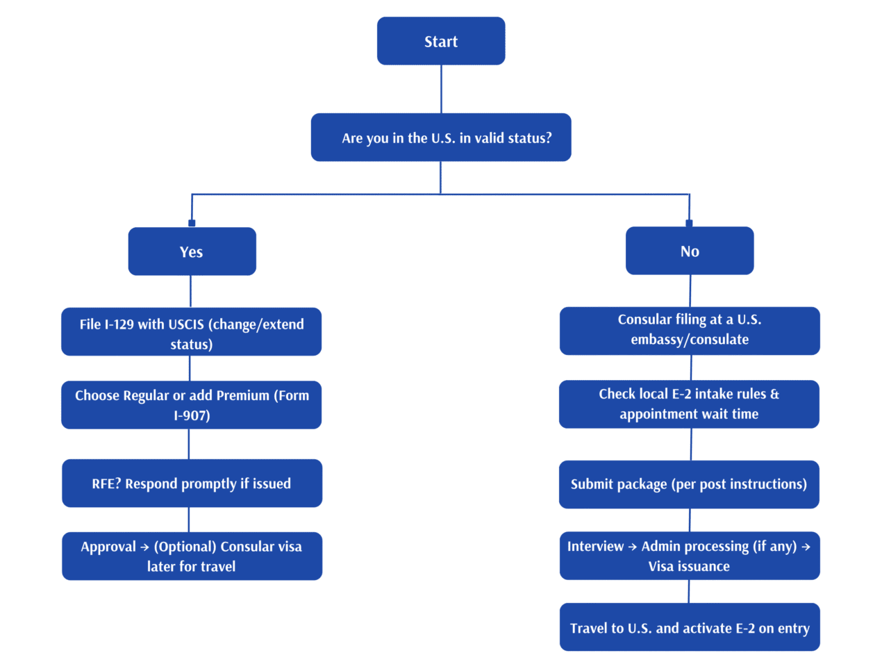 E-2 Visa Processing Time (2025): How Long It Really Takes and Smart Ways to Speed It Up Home » E-2 Visa » E-2 Visa Processing Time (2025): How Long It Really Takes and Smart Ways to Speed It Up On This Page E-2 Processing Times Your Personalized E-2 Timeline Choosing Your Path Why Attorney Guidance is Key evaluate your profile E-2 Visa Processing Times When planning an investment in the United States under the E-2 Treaty Investor Visa, one of the most common questions for investors is: “How long will it take?” Processing time is an essential consideration for business plans, travel schedules, and family transitions. In 2025, wait times continue to vary widely depending on whether you file through a U.S. consulate abroad or with U.S. Citizenship and Immigration Services (USCIS) inside the U.S., and whether you add the Premium Processing option. Developing the right strategy begins with understanding what influences timing. This overview explains what to expect in 2025 and how our team helps investors navigate the process efficiently, from filing strategy to interview preparation, to achieve a faster and smoother E-2 approval. Consular Filing Abroad USCIS Change/Extension of Status in U.S. Filing Path File at a U.S. consulate in your country of citizenship or residence File directly with USCIS from inside the U.S. Premium Processing Not available Available for E-2 filings with USCIS Total Time Components Document preparation + consular review + interview/issuance + passport return Document preparation + USCIS review (regular or premium) Typical Ranges (2025) 2 weeks to 4 months* (depending on consulate/post) Regular: 4 weeks to 6 months*; Premium Processing (Form 1907): USCIS takes 15 business days to issue a decision (if no RFE) with an additional $2,805 fee Biggest Variable Consulate appointment availability (should check the post’s current wait times before planning), Administrative Processing USCIS processing timelines and possibility of Requests for Evidence (RFEs) *Processing times show how long past cases took, not how long yours will take. Every case is different, and actual timing depends on workload and case details. Why Do E-2 Processing Times Vary So Much? The E-2 Treaty Investor Visa allows nationals of treaty countries to invest a substantial amount of capital in a bona fide U.S. enterprise. Petitioners can pursue this status either through consular processing, which involves applying for a visa at a U.S. consulate abroad, or through USCIS, by filing a change or extension of status from within the United States using Form I-129. Key Reasons Processing Timelines Vary : Different decision makers: Consular officers and USCIS adjudicators follow different procedures and timelines. Local post rules: Every consulate has its own E-2 intake and review workflow. Appointment supply schedule: Visa interview slots fluctuate by season and staffing. Case quality: Strong, well-organized filings are less likely to trigger RFEs or administrative processing. Important note for fall 2025: Many U.S. consulates have returned to standard in-person interview procedures after the temporary waiver programs of recent years. E-2 applicants should plan for a personal interview at the U.S. consulate in their country of nationality or lawful residence. Checking your consulate’s current scheduling policies early can help you stay on track and avoid surprises. Read More about the E2 Visa Extension Requirements Your Personalized E-2 Timeline: A Quick Calculator Every E-2 case follows the same general stages, but the total timeline depends on the applicant’s readiness, the chosen filing route, and government processing capacity. Step 1: The process begins with document preparation, which typically takes two to six weeks depending on how quickly the necessary evidence can be assembled. This includes the business plan, proof of lawful investment funds, corporate formation records, and either the DS-160 or I-129 form. Well-prepared and organized documentation is the best safeguard against future delays. Step 2: Once the materials are gathered, the case enters the government’s queue. Petitioners filing through a U.S. consulate must monitor appointment availability and any pre-screening requirements, which vary by post. Because E-2 timelines are not always listed publicly, it is best to verify information directly with the consulate or through your attorney. Those filing with USCIS should review current I-129 processing times at their assigned service center and consider whether Premium Processing is beneficial. Premium Processing guarantees that USCIS will take adjudicative action within fifteen business days, although it does not shorten preparation time. Step 3: The decision phase follows. Consular applicants attend an interview, and in some cases, the application may undergo brief administrative processing before issuance. USCIS applicants can expect either approval, a Request for Evidence (RFE), or a Notice of Intent to Deny (NOID) within the published timeframe, or within the fifteen-day window if Premium Processing applies. Step 4: Once approval is issued, the case concludes with visa issuance or status activation. Consular applicants typically receive their visa within a few days to two weeks following the interview, while USCIS petitioners receive online confirmation immediately, followed by mailed approval notices. For consular cases, E-2 status becomes effective upon admission to the United States. For USCIS filings, the change of status becomes active as of the approval date. Pro tip: Thorough preparation, accurate documentation, and early coordination with counsel remain the most effective ways to streamline this process and avoid unnecessary delays. Choosing your E-2 Path Why Attorney Guidance is Key to Timely E-2 Approvals in 2025 In 2025, E-2 visa processing continues to vary significantly, not only between consulates and USCIS but also among consulates themselves. Because nationality