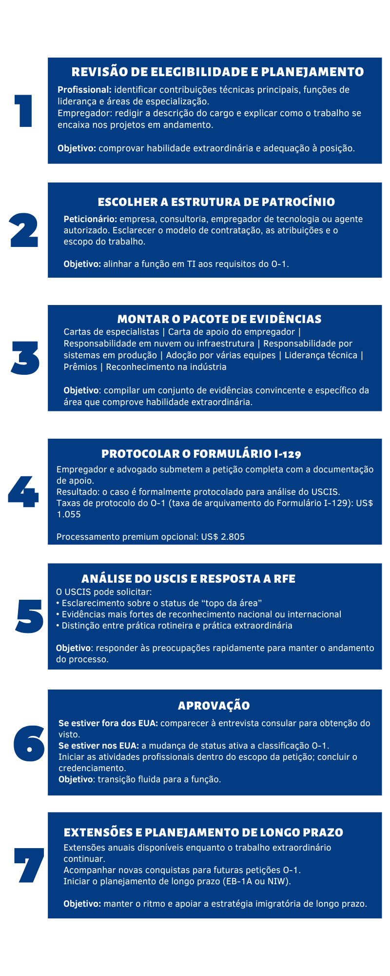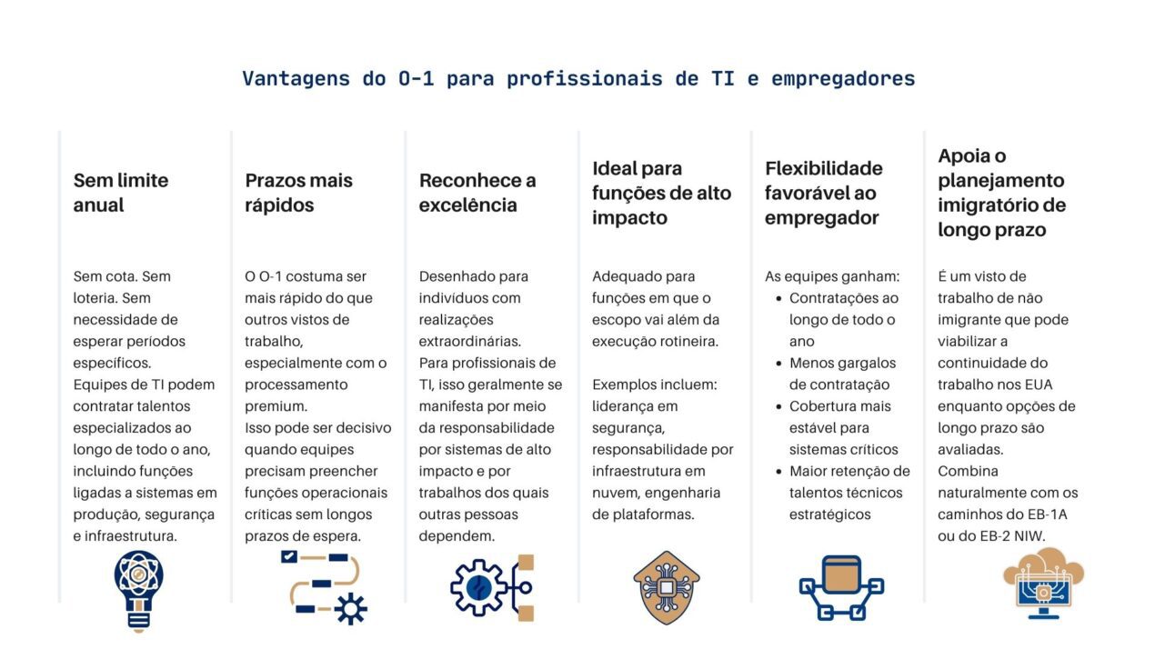 Nesta Página O que é o visto O-1 Principais tipos de evidências para profissionais de TI Guia passo a passo do visto O-1 para profissionais de TI Processo prático e desafios comuns Conselhos para profissionais de TI avalie o seu perfil Uma falha em produção não é um erro abstrato. Ela interrompe transações, prejudica o acesso dos clientes e obriga as equipes a responderem imediatamente. Um incidente de segurança não é um simples inconveniente técnico. Ele cria exposição, aciona obrigações de reporte e pode alterar a forma como uma organização opera. Em TI corporativa, engenharia de software, infraestrutura em nuvem, cibersegurança, engenharia de dados, operações de IA, DevOps e arquitetura de sistemas, o trabalho é definido por essa realidade. Os sistemas estão ativos. Os dados são sensíveis. Erros têm consequências. Por esse motivo, casos de visto O-1 para profissionais de TI exigem uma abordagem diferente daquela usada em casos baseados em pesquisa acadêmica ou invenções visíveis ao público. As narrativas mais fortes em TI focam na confiança operacional. Elas demonstram quem é acionado quando o tempo de atividade está em risco, quem tem permissão para projetar controles de acesso e arquitetura de segurança, e quem é responsável pela infraestrutura da qual outras equipes dependem para entregar, monitorar e recuperar sistemas. Essas responsabilidades não são rotineiras. Elas refletem um nível de credibilidade conquistado por meio de responsabilidade repetida em ambientes de alto impacto. O visto O-1 é uma categoria de não imigrante para indivíduos que demonstraram habilidade extraordinária e reconhecimento sustentado em sua área. Para profissionais de TI, esse reconhecimento costuma ser interno. Ele geralmente aparece na forma de autoridade sobre sistemas em produção, responsabilidade por plataformas críticas, liderança durante incidentes e um histórico de construção de sistemas que escalam mantendo confiabilidade e segurança. Este artigo explica como documentar esse tipo de posicionamento de maneira alinhada ao enquadramento do O-1, sem depender de modelos de publicação acadêmica ou de credenciais genéricas de tecnologia. O que é o visto O-1 O visto O-1 é uma categoria de não imigrante destinada a indivíduos que demonstraram habilidade extraordinária e reconhecimento sustentado em sua área de atuação. Muitos profissionais de TI buscam enquadramento no O-1A, que se aplica a atividades nas áreas de ciência, educação, negócios e campos relacionados. Em TI, o reconhecimento geralmente surge da responsabilidade operacional, e não de publicações acadêmicas ou prêmios públicos. Uma petição forte explica como o trabalho do profissional se destaca dentro da área e demonstra um histórico consistente de confiança em ambientes de produção. Para funções de software e infraestrutura, as evidências costumam se concentrar na responsabilidade por serviços centrais, metas de confiabilidade, trabalho de escalabilidade, decisões de arquitetura em nuvem e liderança durante implantações e incidentes. Para profissionais de cibersegurança, o foco pode estar na arquitetura de segurança, liderança em resposta a incidentes, supervisão de conformidade e acesso confiável a sistemas sensíveis. O reconhecimento sustentado em TI pode ser demonstrado por meio da seleção recorrente para responsabilidades de alto impacto, da gestão de longo prazo de plataformas críticas, da adoção de ferramentas internas por múltiplas equipes ou da dependência documentada de trabalhos open source. O visto O-1 autoriza trabalho temporário vinculado a uma petição aprovada e não concede residência permanente. Alguns profissionais posteriormente buscam o EB-2 NIW ou o EB-1A, dependendo de seus planos de longo prazo, mas essas categorias são avaliadas de forma independente. Principais tipos de evidências para profissionais de TI Sistemas em produção e responsabilidade por plataformas Em muitas carreiras de TI, as evidências mais fortes começam com a responsabilidade por sistemas em produção. O objetivo é demonstrar a responsabilidade por um serviço ou plataforma ativa da qual outras pessoas dependem, e documentar como essa responsabilidade impactou disponibilidade, estabilidade e a segurança das implantações. Registros úteis geralmente incluem documentação de ownership, responsabilidade por deploys e envolvimento em incidentes, conectando diretamente o profissional a decisões tomadas sob pressão operacional. Liderança em nuvem e infraestrutura Evidências em nuvem e infraestrutura são mais persuasivas quando demonstram autoridade, e não apenas participação. Isso pode incluir liderança em migrações, responsabilidade por decisões de arquitetura ou prestação de contas por resultados de confiabilidade e performance em produção. Registros que mostram gestão de infraestrutura ao longo do tempo tendem a ter mais peso, pois refletem confiança e responsabilidade sustentadas. Arquitetura de segurança e resposta a incidentes Trabalhos em segurança são mais fortes quando apresentados como gestão de riscos em ambientes ativos. As evidências podem incluir responsabilidade por controles de acesso, decisões de design de segurança, liderança em resposta a incidentes, correção de vulnerabilidades ou atividades de conformidade ligadas a sistemas sensíveis. O foco deve permanecer na responsabilidade confiável, e não apenas no domínio de ferramentas. Ferramentas internas adotadas por várias equipes Plataformas internas ganham relevância quando são utilizadas além de uma única equipe. Se um profissional construiu ou liderou um sistema adotado por outros times, essa adoção em si se torna uma evidência de reconhecimento. Ela demonstra que o trabalho era escalável, confiável e considerado seguro para uso diário por outras pessoas. Trabalho open source com uso externo documentado Contribuições ope